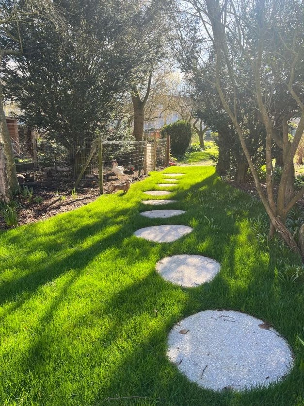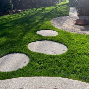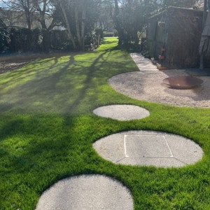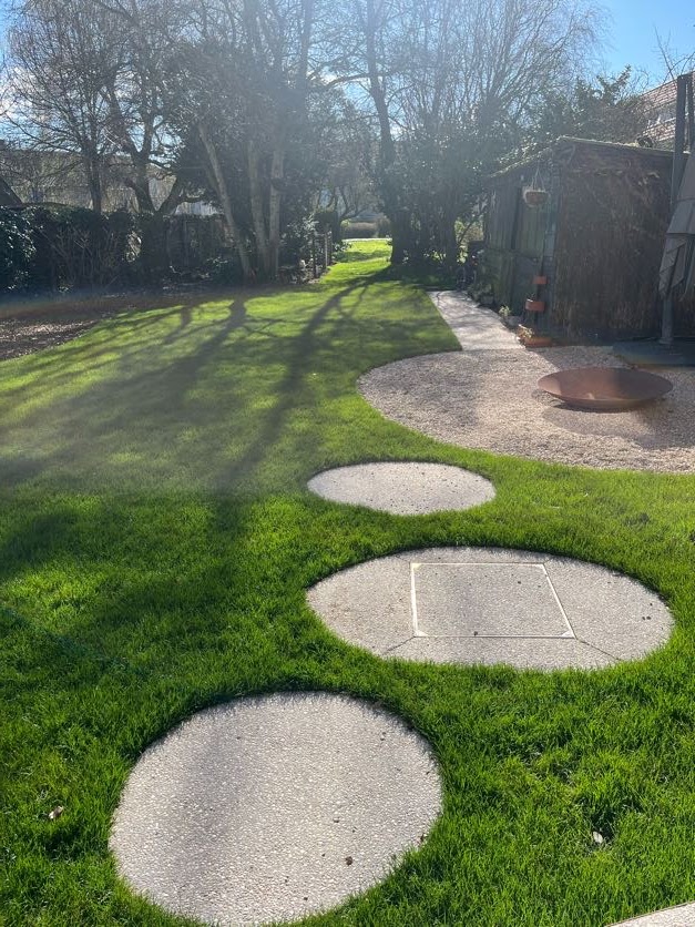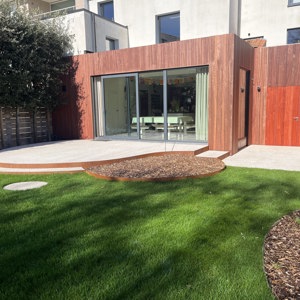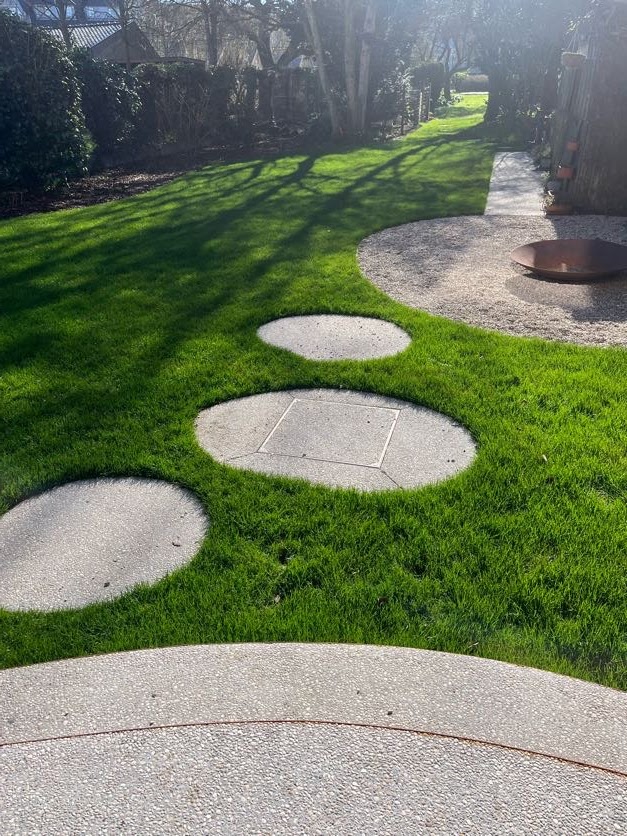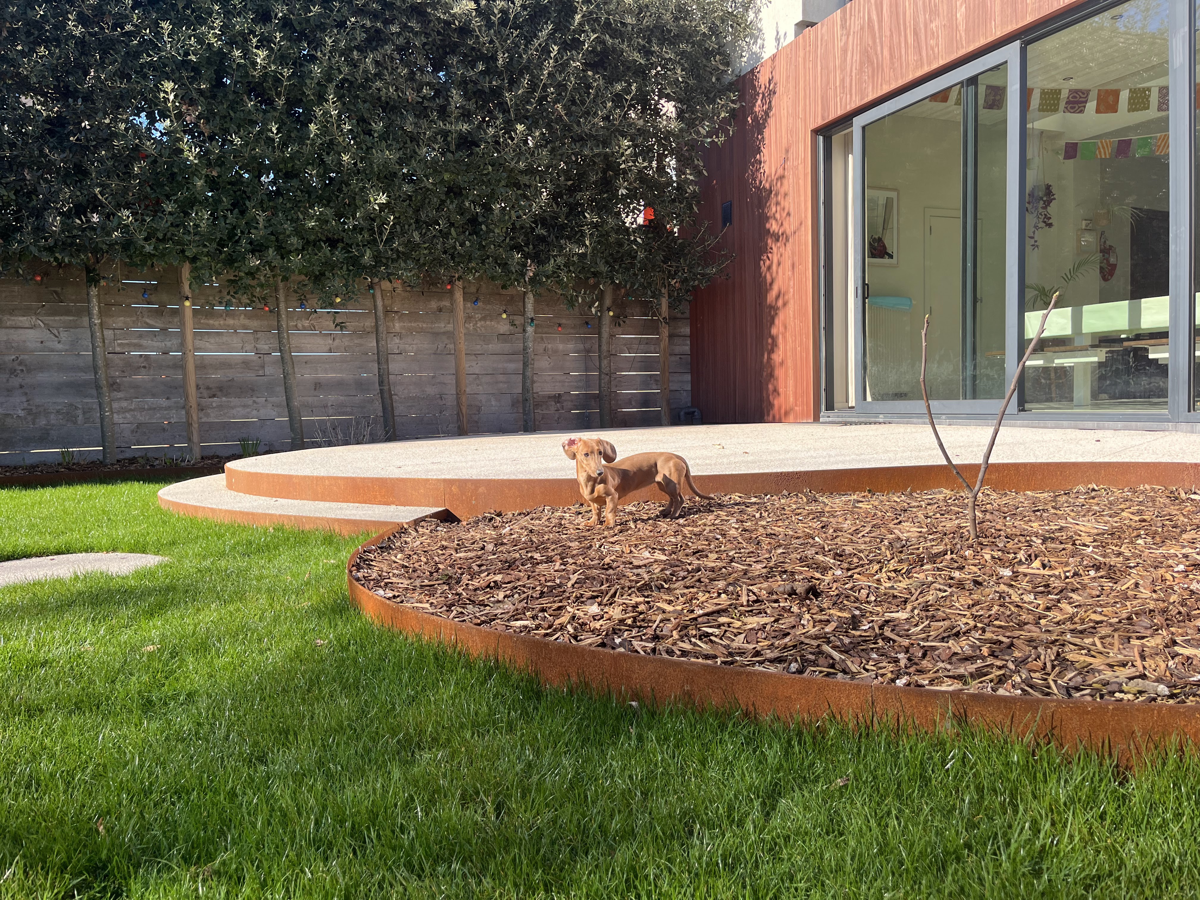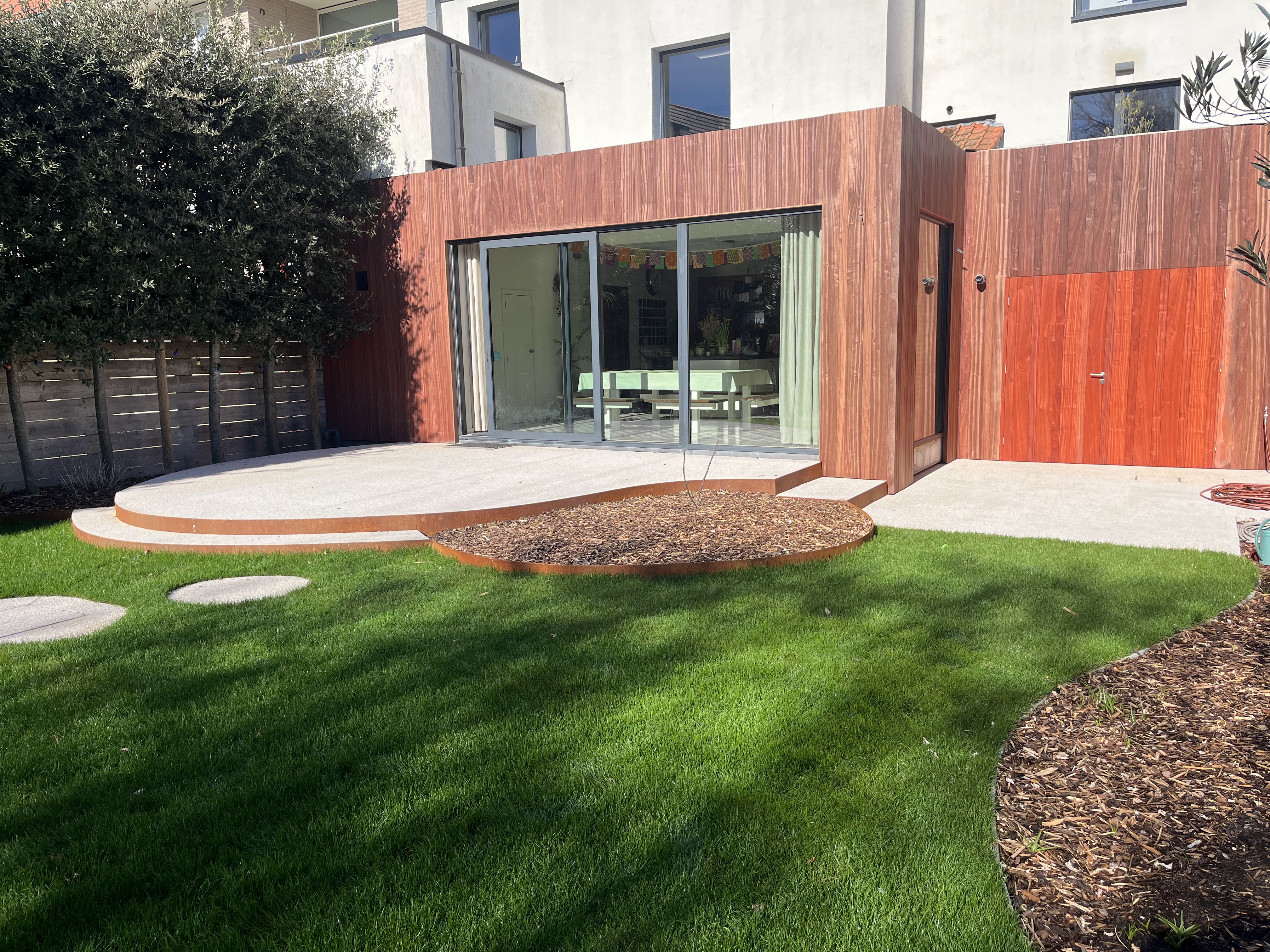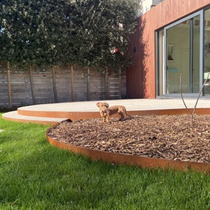 In deze stadstuin werd gekozen voor uitgewassen beton met afgeronde vormen en een cortenstaal afboording